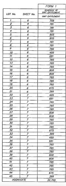 Here is an example of one of those charts showing the unit entitlement for each lot and the aggregate amount at the bottom of the page;